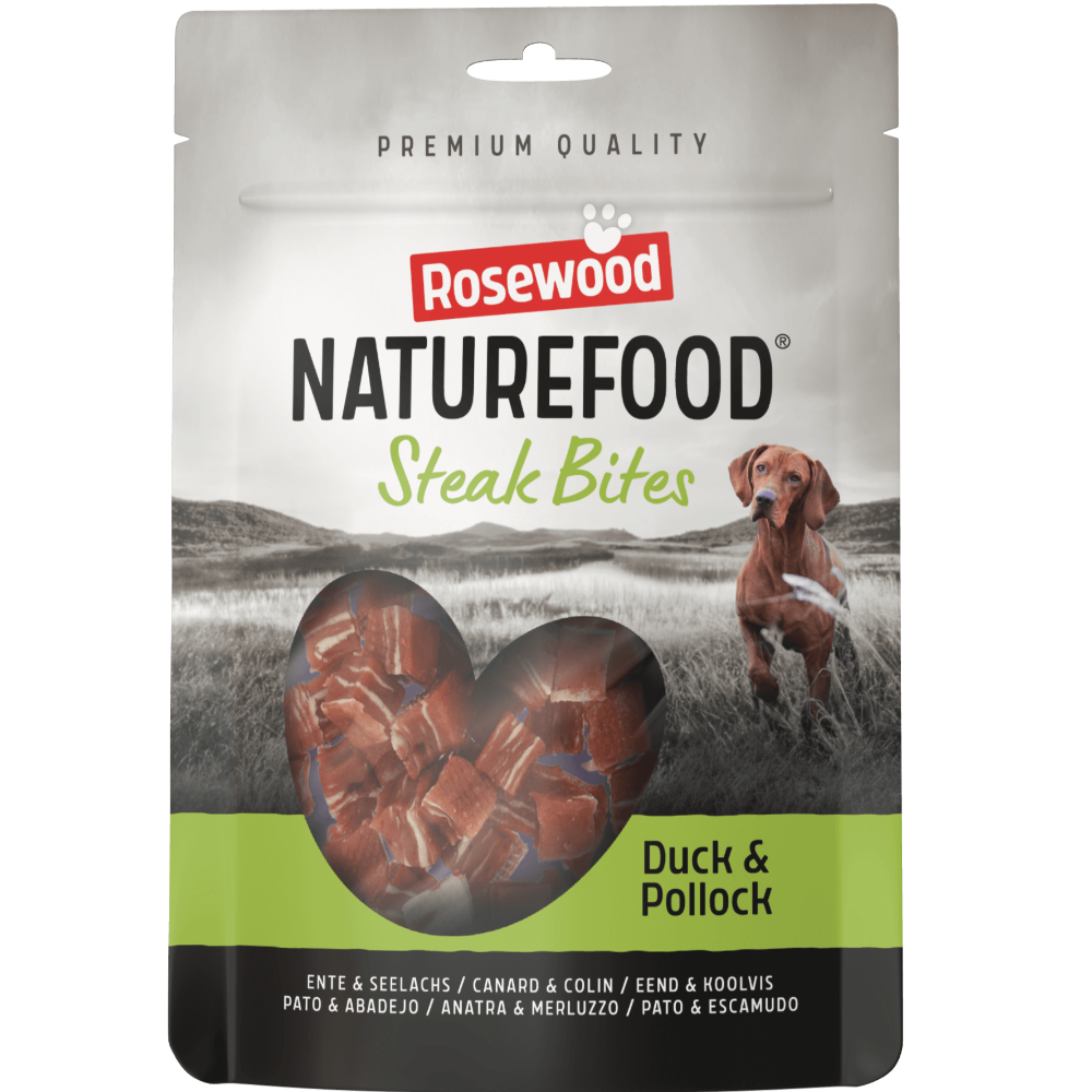 Rosewood Naturefood Steak Bites is een premium snack zonder goedkope, ongezonde vulmiddelen zoals granen en suikers. Het bestaat voor ongeveer 93% uit eend en koolvis!
