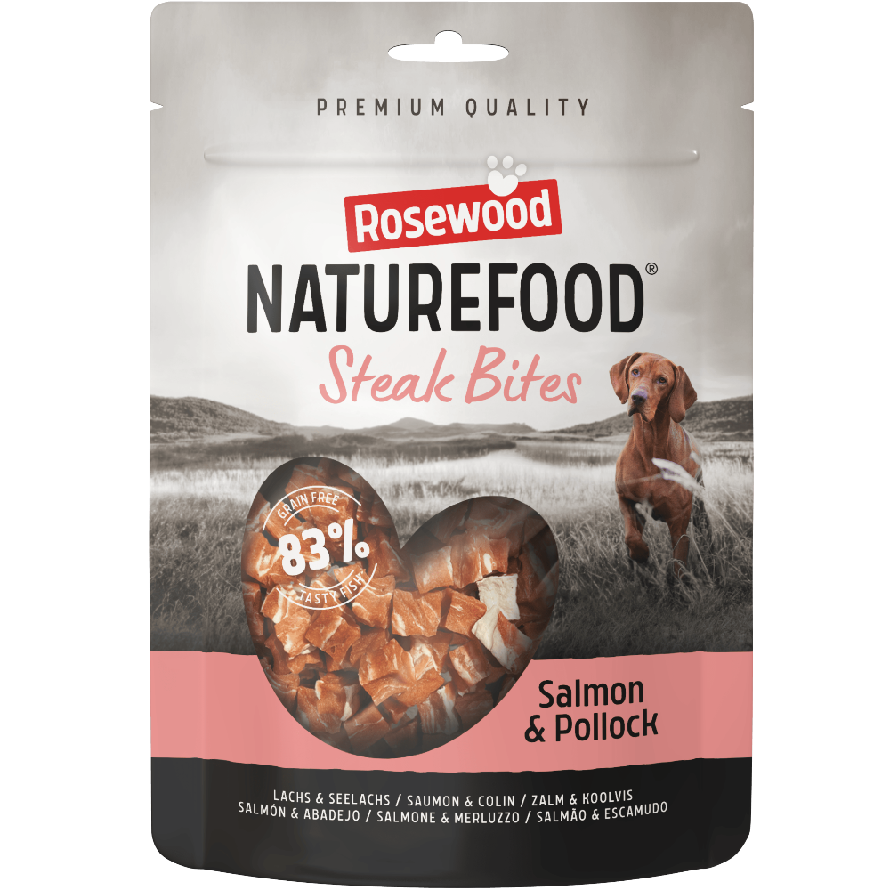 Rosewood Naturefood Steak Bites is een premium hondensnack zonder goedkope, ongezonde vulmiddelen zoals granen en suikers. Het bestaat voor ongeveer 83% uit zalm en koolvis!