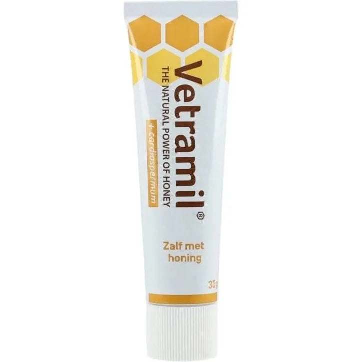 De Vetramil honingzalf bevat tevens Cardiospermum. Deze plant heeft van nature een ontstekingsremmende werking en is zeer effectief tegen roodheid en jeuk.