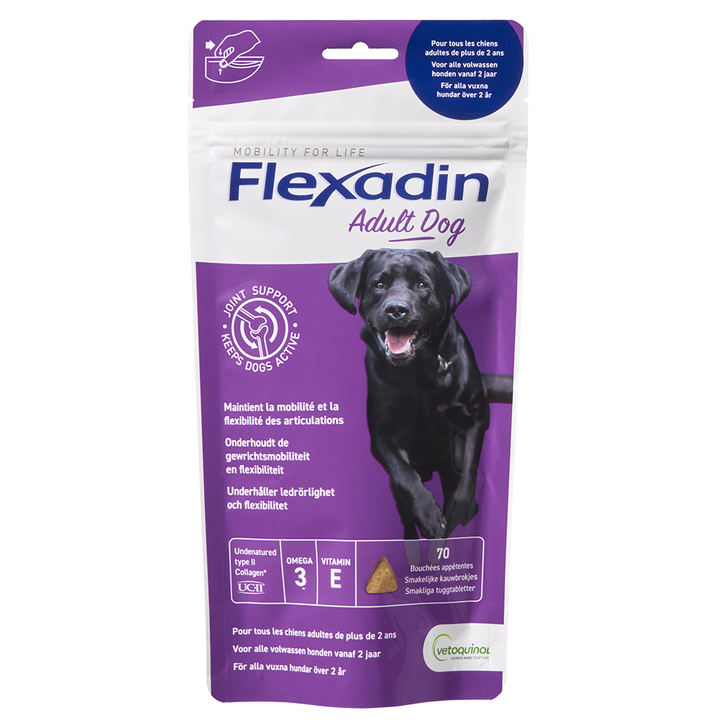 Flexadin Adult Dog werd ontwikkeld om aan de specifieke noden te voldoen van volwassen en senior honden, ouder dan 2 jaar. Flexadin Adult Dog bevat de unieke combinatie van UC-II®, Omega 3-vetzuren en Vitamine E ter ondersteuning van de gewrichten van je hond.